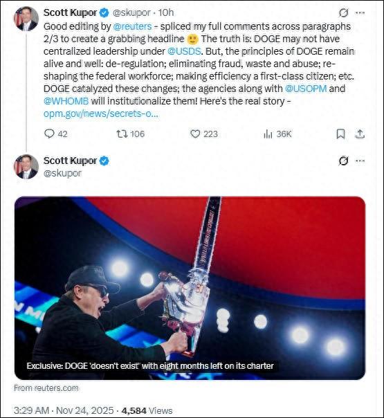 11月23日,路透社的一则报说念,从头唤起了外界对DOGE的怜惜。只不外这回与砍钱再无关联。